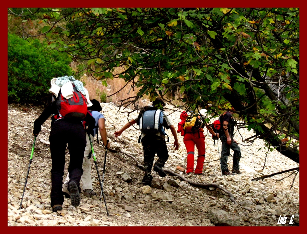 Ascendíamos lentamente por el serpenteante sendero. Unos puntitos de pintura nos guiaban. La subida era fuerte por terreno pedregoso. Nos parábamos para admirar el paisaje y aligerar el resuello. Las panorámicas se alargaban hasta el mar. La inclinación del terreno era tenaz, afanosa para nuestra ascensión en un declive de peñas y matorrales. El terreno estaba cubierto, principalmente, de matas de boj. A medida que subíamos no nos imaginábamos por donde íbamos a llegar hasta las terrazas superiores. Parecía no existir un paso factible ante el caos geológico de las murallas que aparecían ante la vista, formadas por incontables e impenetrables agujas, bloques, cornisas, escarpes y barras rocosas a modo de contrafuertes.